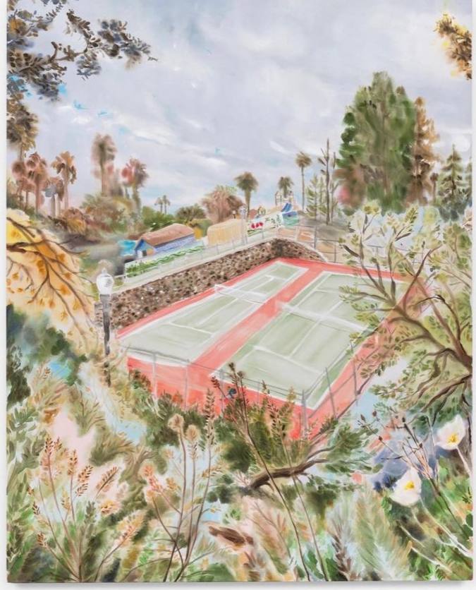 В противовес ей, а, может, в дополнение – работа Джейка Шейнера (Jake Sheiner), изображающая те же корты, но уже наполненные солнцем, цветами и цветом! Джейк Шейнер — художник из Лос-Анджелеса. В 2008 году он получил степень BFA в Школе искусств Института Чикаго. У этого художника есть серия работ на тему теннисных кортов, часть из них, представлю на ваш суд.